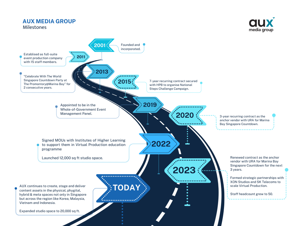 AUX Media Group is a Singapore based event and production company known for delivering national projects, immersive experiences, and brand activations. Our work spans creative development, technical execution, and live or digital production across many industries.